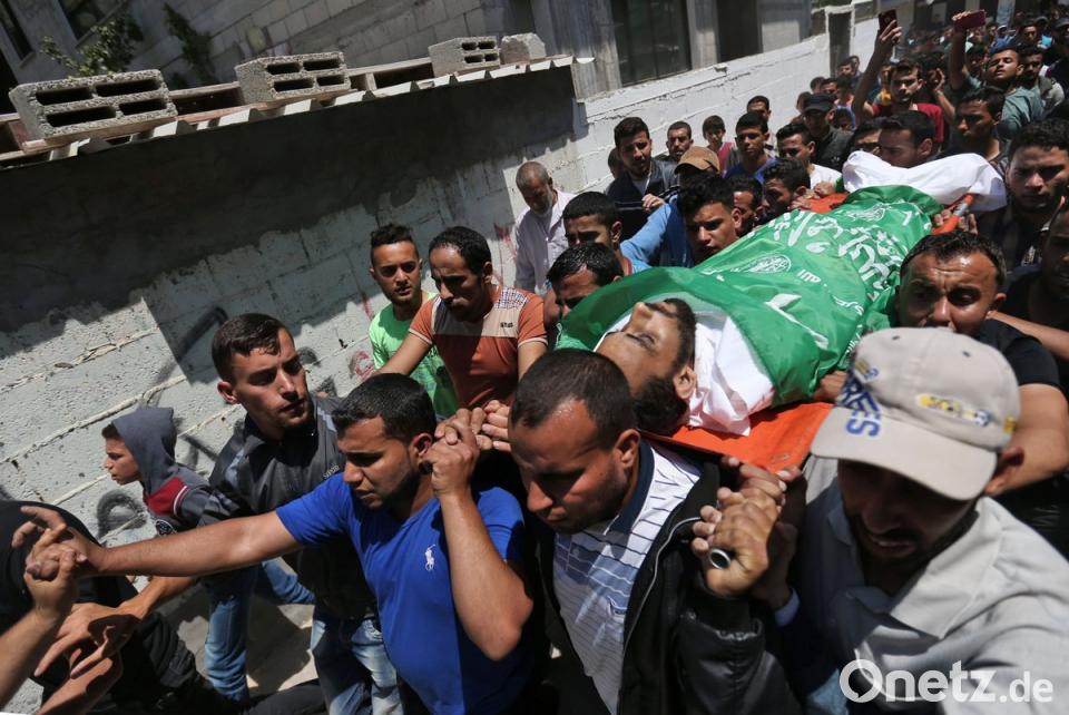 Tel Aviv/Gaza. Nach dem blutigsten Tag in dem Palästinensergebiet seit dem Krieg 2014 begraben die Menschen am Dienstag ihre Toten. Mindestens 60 Palästinenser sind bei Massenprotesten an Israels Grenze von israelischen Soldaten getötet worden, darunter mehrere Minderjährige - während Israel und die USA in Jerusalem die Eröffnung der US-Botschaft feierten. Der Blutzoll erscheint unfassbar hoch: An einem Tag allein kamen mehr Menschen ums Leben als in den ganzen sechs Wochen seit Beginn des "Marsches der Rückkehr" am 30. März.