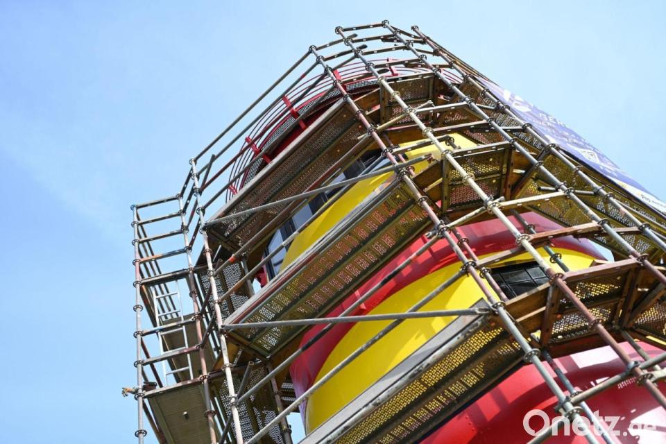 Seit Mitte Januar ist der elf Meter hohe Turm eingerüstet, damit alle sieben roten und gelben Ringe neu gestrichen werden können. „Das ist das letzte Mal 2020 passiert und nun sechs Jahre her“, erzählt Rosenberg. Die Arbeiten würden bewusst jetzt im Winter geleistet, wo es am Turm ruhiger zugehe. Zwischenzeitlich wurden die Malerarbeiten wegen der frostigen Witterung allerdings eingestellt.