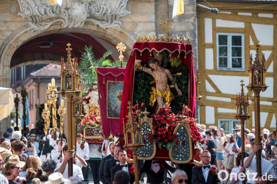 Eine sehr lange Tradition hat auch die Fronleichnamsprozession in Bamberg - inklusive genauer Ordnung: "Traditionell reihen sich in den Zug zahlreiche verschiedene Gruppen und Organisationen ein", heißt es vorab von der dortigen Pressestelle: "die Pfarreien mit ihren Geistlichen und den Ministranten, die Ritterorden, die Ordensfrauen, Mitglieder der Räte und Gremien, die Honoratioren aus Stadt und Landkreis Bamberg sowie die Bruderschaften, Innungen und Vereine, die das Erbe der Zünfte pflegen, darunter die Bamberger Gärtner und viele mehr". Mitgetragen wird bei der Prozession auch das Domkreuz - ein 600 Kilogramm schweres reich verziertes Reliquienkreuz.