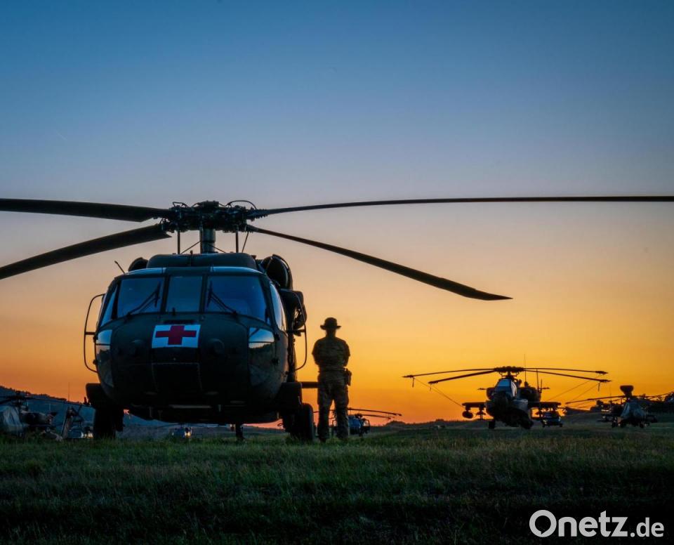 Die Langzeitbelichtung zeigt, wie MEDEVAC-Crews im Sonnenuntergang ihre MH-60 für die Missionen am nächsten Tag vorbereiten. Aufgenommen am Truppenübungsplatz in Hohenfels während der Übung "Sabre Junction 20".
