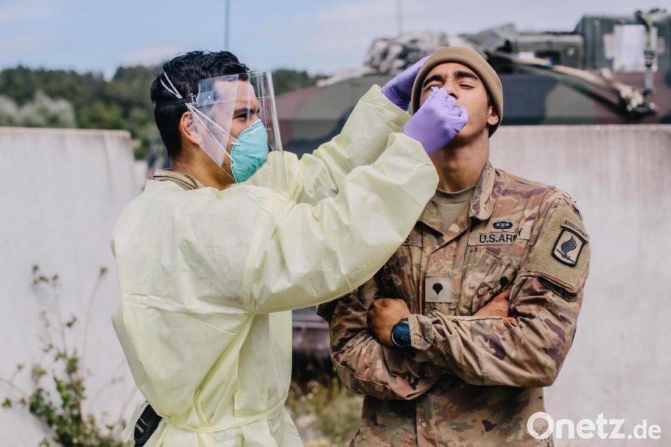 Ein Sanitäter-Fallschirmjäger der US-Armee, der dem 1. Bataillon des 503. Infanterieregiments der 173. Luftlandebrigade zugeteilt ist, testet einen Soldaten auf COVID-19 während der Übung "Sabre Junction 20" auf dem Truppenübungsplatz in Grafenwöhr. 20. August 2020