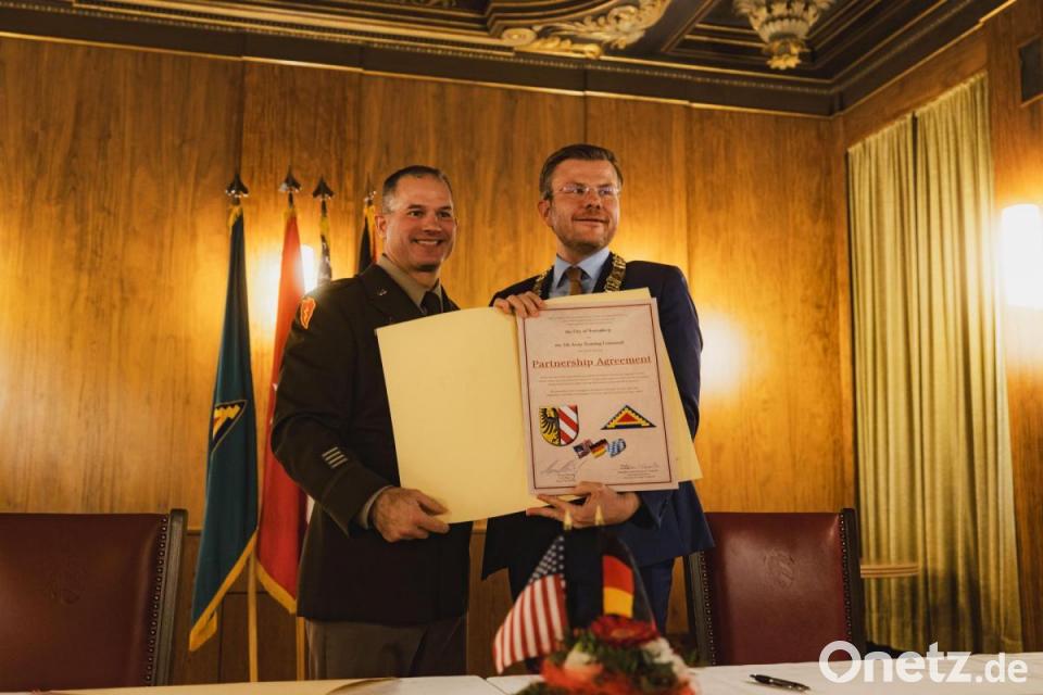 Bei einer feierlichen und herzlichen Zeremonie haben das Ausbildungskommando der US-Armee in Europa und die Stadt Nürnberg eine Partnerschaft geschlossen. Der Kommandeur der in Grafenwöhr stationierten Einheit, General Steven Carpenter, und Nürnbergs Oberbürgermeister Marcus König (CSU) haben die Partnerschaftsurkunde am vergangenen Freitag feierlich im Nürnberger Rathaus unterzeichnet und anschließend mit einer Umarmung besiegelt.