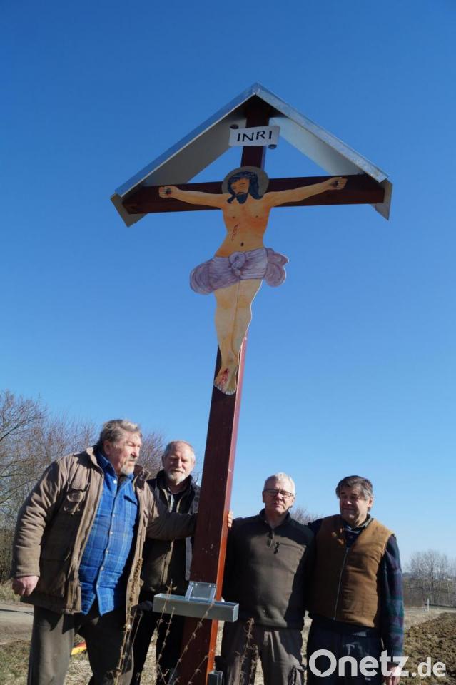 Dort stellte sich rasch heraus: Das Kreuz ist nicht mehr zu reparieren; zu marode und verwittert war das Holz in den Jahren geworden. Also musste ein neues Kreuz her. Das fertigte Hlovoska in seiner Schreinerei und befestigte darauf den rund 1,70 Meter großen Christuskorpus. Danach bemalte der Künstler die aus Blech geschnittene Figur neu. Bei der Aktion wurde dem Flurdenkmal auch ein witterungsbeständiges Dach spendiert.