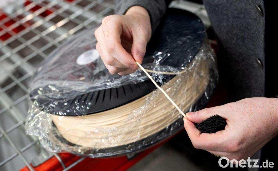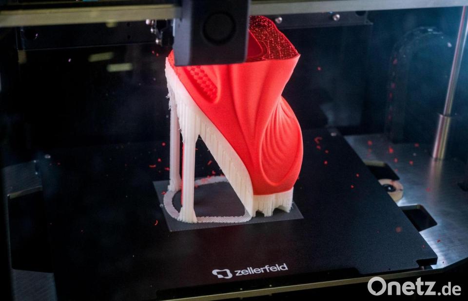 Jede Einheit ist ein schwarzer, mannshoher Kasten. Und darin, hinter einer Glasscheibe, entsteht innerhalb von 12 bis 24 Stunden aus einem dünnen Kunststofffaden ein Paar Turnschuhe. Einzelbestellungen werden exakt auf den eigenen Fuß angepasst. Den voll recycelbaren „Zellerfoam“ hat Schmitt patentieren lassen, ebenso die Technik für den 3D-Druck der Schuhe.