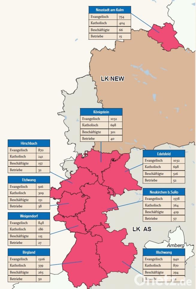 Auffällig bei der Verteilung dieser Sonderfälle: Alle neun betroffenen Kommunen liegen im fränkisch-oberpfälzischen Grenzgebiet. Acht Gemeinden zählen dabei zum Landkreis Amberg-Sulzbach, westlich von Sulzbach-Rosenberg. Dazu kommt die Stadt Neustadt am Kulm, die heute Teil des Landkreises Neustadt/WN ist, lange aber zum protestantischen Markgrafentum von Bayreuth zählte. Deshalb führt die kleinste Stadt der Oberpfalz bis heute das Dasein einer protestantische Enklave in der sonst stark katholisch geprägten Region um den Rauhen Kulm.