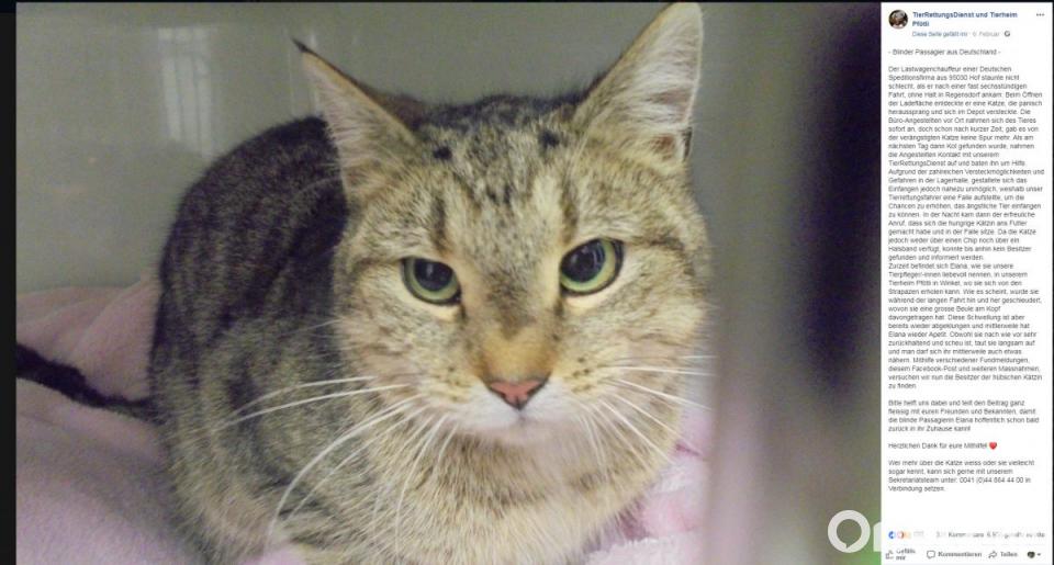 Die folgende Nacht brachte den gewünschten Erfolg. Die Katze war in die Falle gegangen. Allerdings konnten die Tier-Retter nicht feststellen, wem die Katze gehört, da sie weder gechipt war noch ein Halsband trug. Die Tierpfleger haben den blinden Passagier auf den Namen Elena getauft. "Wie es scheint, wurde sie während der langen Fahrt hin und her geschleudert, wovon sie eine große Beule am Kopf davongetragen hat. Diese Schwellung ist aber bereits wieder abgeklungen, und mittlerweile hat Elana wieder Apetit", heißt es im Facebook-Beitrag von "Pfötli". Per Facebook sucht das Tierheim jetzt nach den Katzeneltern, die wahrscheinlich aus Hof kommen.