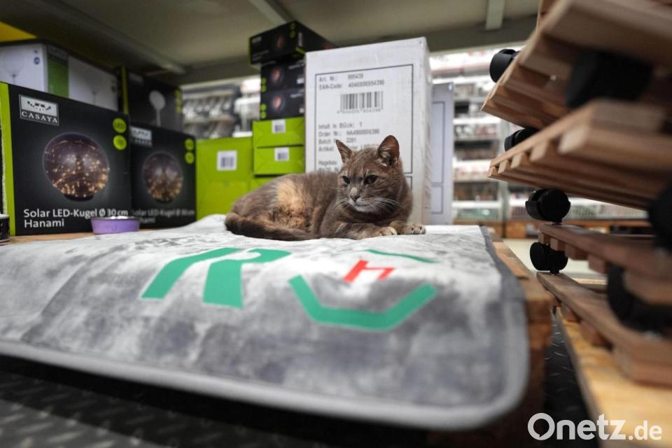 Seit dem letzten Sommer sei Lotti jeden Tag im Markt, streunere durch die Gänge - vorbei an Schrauben, Blumenerde und Glühbirnen - und lasse sich von den Mitarbeitern des Markts mit Leckerlis verwöhnen. Am häufigsten findet man die bereits 18 Jahre alte Katze allerdings auf ihrem Platz auf einer Decke zwischen den Regalen. Hier steht auch ihr Futternapf.