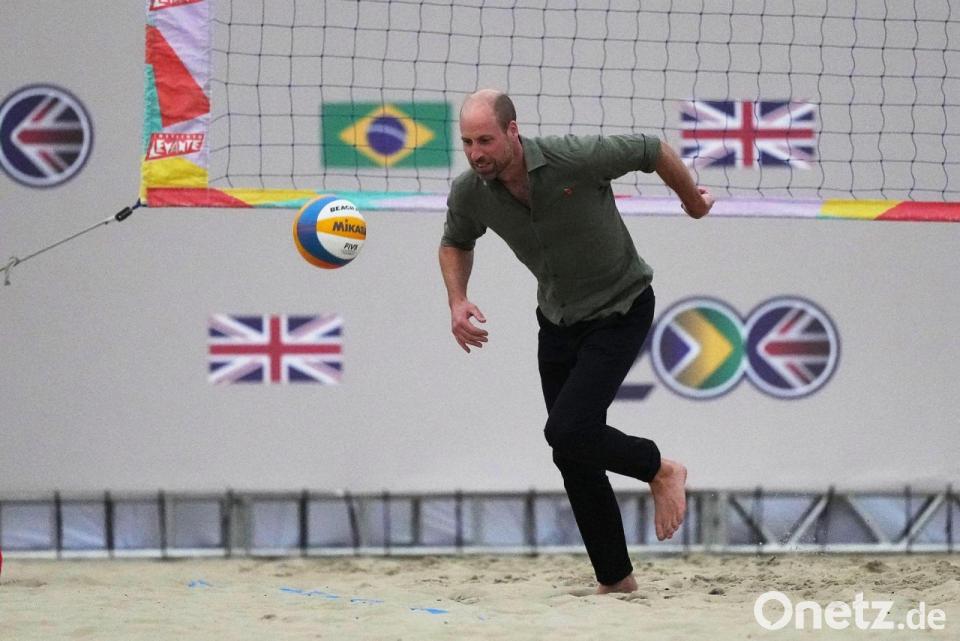 Der britische Thronfolger Prinz William hat seine Brasilien-Reise mit einer Partie Beachvolleyball an der legendären Copacabana begonnen. Der 43-Jährige zog Schuhe und Socken aus und spielte eine Runde unter anderem mit der brasilianischen Olympiateilnehmerin Carolina Solberg.