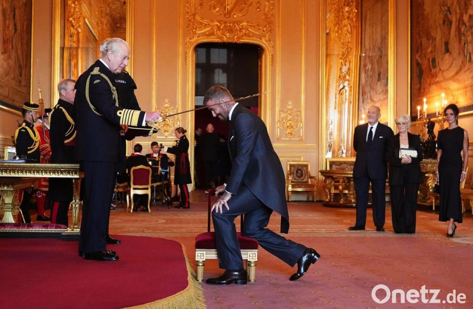 Sir David Beckham ging auf ein Knie, senkte den Kopf - und erhielt im prunkvollen Saal des Windsor Castle den Ritterschlag von König Charles. Beim folgenden Händedruck lächelten sich die beiden Männer an. Nach jahrelangem Warten genoss der frühere englische Fußball-Nationalspieler die Zeremonie als „Knight Bachelor“, als Ritter ohne Ordenszugehörigkeit, am Vormittag sichtlich.