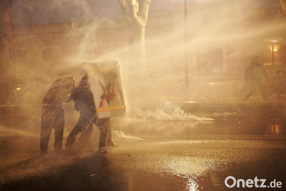 Aus der Menge flogen Steine, Molotowcocktails und andere Gegenstände in Richtung der Polizei. Mehrere Müllcontainer standen in Brand. Auch ein Einsatzwagen brannte. Die Ordnungskräfte setzten Tränengas und Wasserwerfer ein. Ein Demonstrant wurde mit Kopfverletzungen weggebracht.