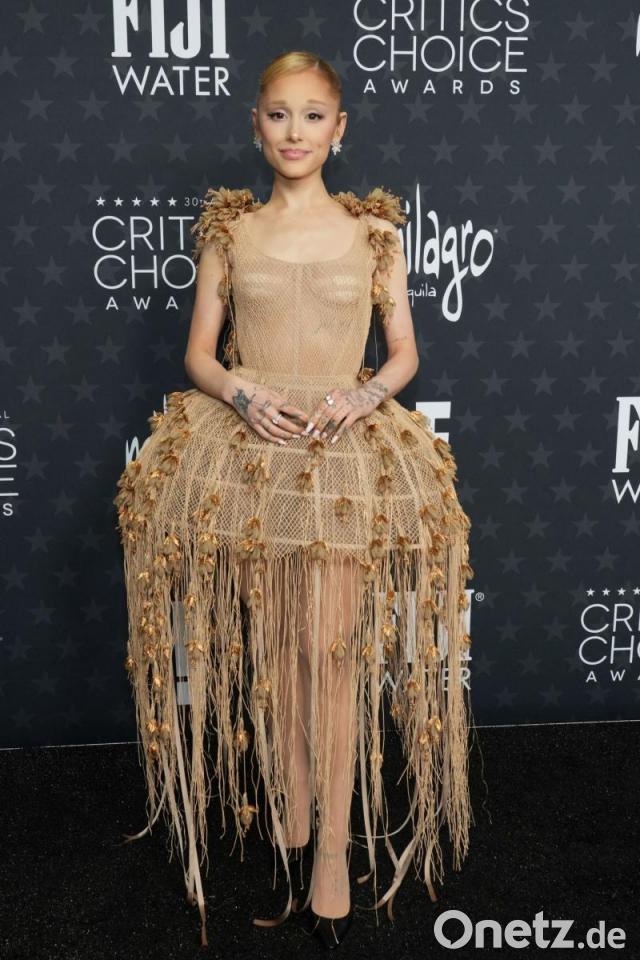 Popsängerin Ariana Grande, Hexe Glinda aus „Wicked“, musste sich in der Nebendarstellerin-Kategorie zwar Zoe Saldaña („Emilia Pérez“) geschlagen geben, sorgte aber mit einem Dior-Kleid für Aufsehen (Käfigstruktur, bedeckt mit Blumenapplikationen und einem Fransenabschluss).