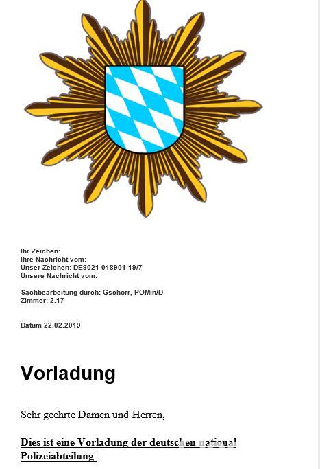 In den vergangenen Tagen wurden in Bayern eine Vielzahl von gefälschten E-Mails verschickt, die eine Vorladung durch die Bayerische Polizei vortäuschen sollen. Laut den E-Mails sei der Empfänger einer Straftat verdächtig und soll sich auf einer dort genannten Polizeidienststelle zu einer Vernehmung einfinden.