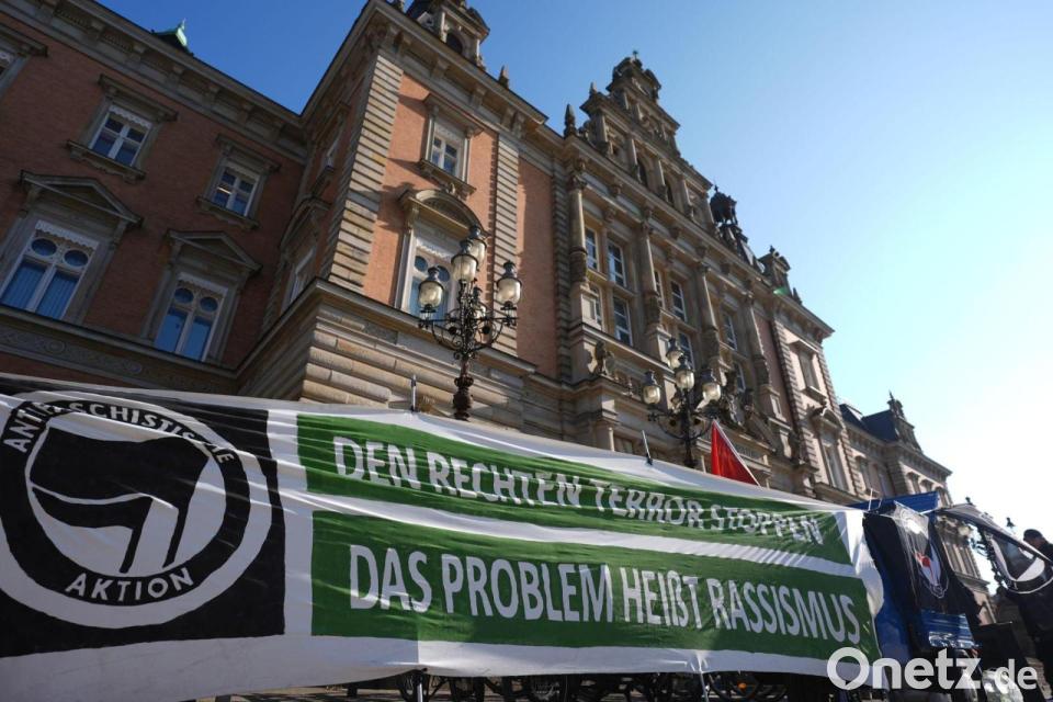 Vor dem Gerichtssaal demonstrierten Mitglieder der Antifa. Auf einem Banner stand „Den rechten Terror stoppen. Das Problem heißt Rassismus“.