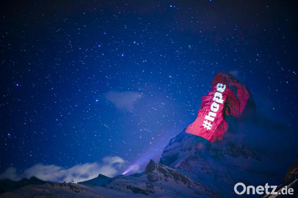 Der wie ausgestorbene Wintersportort Zermatt macht das Matterhorn zum Symbol der Hoffnung in schweren Zeiten: Ein Lichtkünstler wirft abends für mehrere Stunden ein Licht auf das markante Wahrzeichen der Schweiz. Auf dem Felsmassiv erscheint zum Beispiel der Schriftzug "Hope" (Hoffnung) oder die quadratische Schweizer Flagge mit dem weißen Kreuz auf rotem Grund. Die Ortschaft hat den Lichtkünstler Gerry Hofstetter mit der Aktion beauftragt.