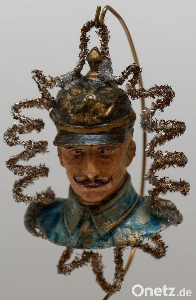 Es sind vor allem zwei Vitrinen, die den Wahnsinn dieser Zeit widerspiegeln und gerade jetzt in der Adventszeit betroffen machen. Die Unikate darin hat die Familie Damberger aus Ebnath für die Zeit der Ausstellung zur Verfügung gestellt. Darin sind Christbaumschmuck, Kinderspielzeug und religiöse Utensilien, die Familien den Soldaten im Feld zu Weihnachten geschickt haben, präsentiert. Christbaumkugeln mit den Konterfeis von Wilhelm II. oder Graf Zeppelin waren damals der letzte Schrei in den Wohnzimmern der Bourgeoisie.