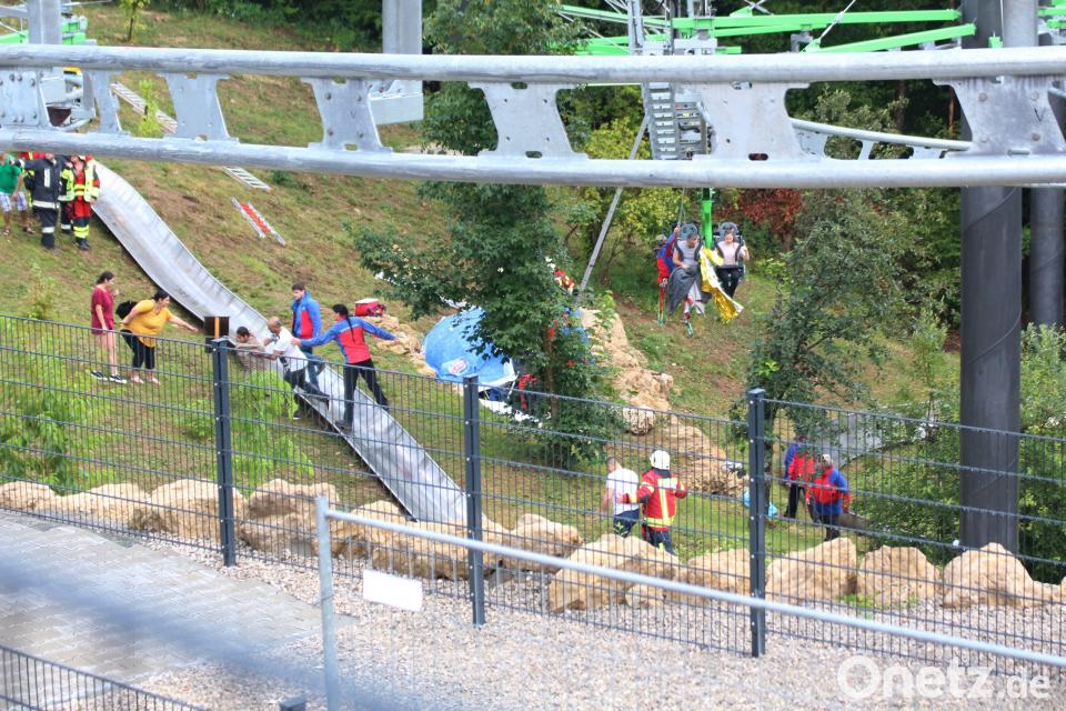 Pottenstein (dpa/lby) - An einer Sommerrodelbahn in Pottenstein (Landkreis Bayreuth) sind bei einem Gewitter mehrere Menschen in Gondeln steckengeblieben. Zwei Fahrgäste erlitten dabei am Sonntag Prellungen, als das Fahrgeschäft plötzlich stoppte, wie ein Polizeisprecher sagte. Acht Menschen seien von Höhenrettern der Bergwacht gerettet worden. Zwei von ihnen litten unter einer leichten Unterkühlung, weil sie den Angaben nach vom Regen durchnässt waren. Nach Angaben der Polizei verursachte wohl ein Blitzeinschlag einen technischen Defekt und damit den unfreiwilligen Stopp der Gondeln.
