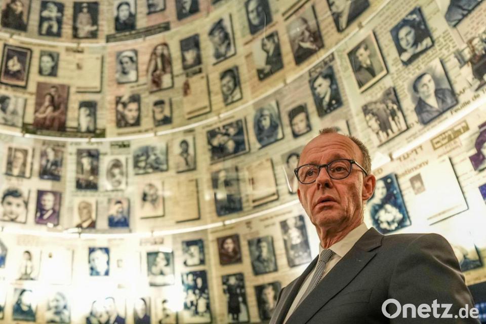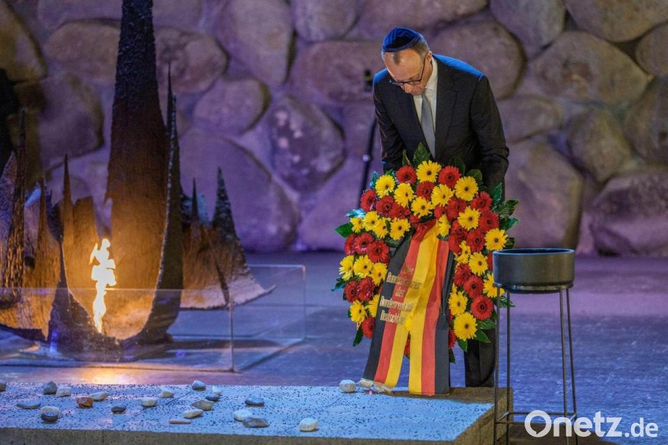 Zu Beginn seines zweiten Besuchstags verneigte sich Merz in der Gedenkstätte Yad Vashem vor den während der Nazi-Diktatur ermordeten sechs Millionen Juden. „Wir werden die Erinnerung lebendig halten an das furchtbare Verbrechen der Shoa, das Deutsche am jüdischen Volk begangen haben“, schrieb er in das Gästebuch. Merz legte anschließend in der Halle der Erinnerung einen Kranz nieder und entzündete die Ewige Flamme.