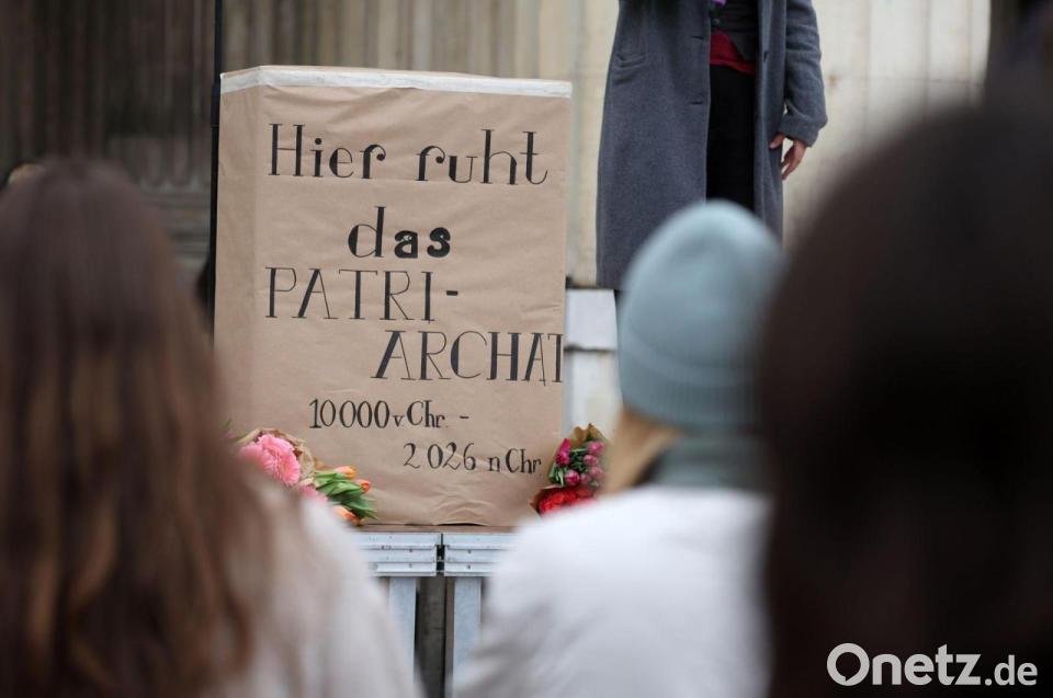 Trotz wachsender gesellschaftlicher Aufmerksamkeit und einzelner politischer Maßnahmen blieben grundlegende Veränderungen aus, kritisierten Rednerinnen. In einem symbolischen Akt beerdigten die Aktivistinnen das Patriarchat, an einem Grabstein aus Pappe wurden Blumen niedergelegt.