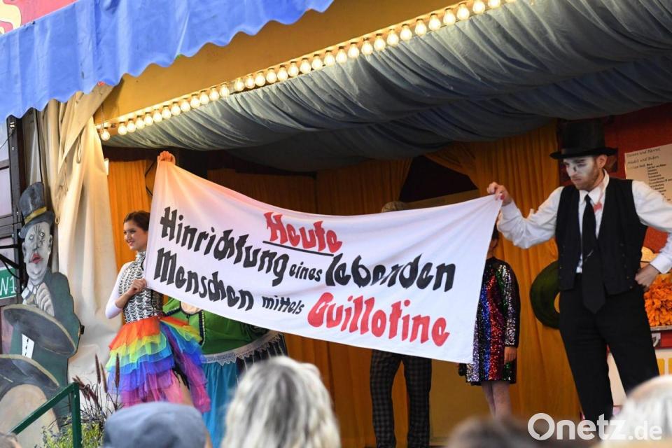 In dem Theater wird vor Publikum per illusionistischer Bühnenmechanik die simulierte „Enthauptung einer lebenden Person auf offener, hell erleuchteter Bühne mittels Guillotine“ zelebriert. An jedem Wiesntag gibt es ungefähr 20 Vorstellungen, etwa alle halben Stunden wird enthauptet - und damit jedenfalls mehr als 300 Mal an den mindestens 16 Festtagen.