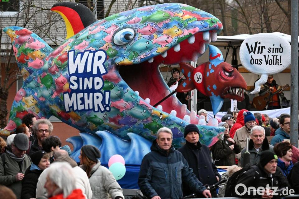 Vor dem Veranstaltungsort wurde auch ein Anti-AfD-Wagen des Düsseldorfer Künstlers Jacques Tilly aufgefahren. Darauf zu sehen: ein großer bunter Fisch mit der Aufschrift „Wir sind mehr!“, der einen kleineren mit der Aufschrift „Wir sind das Volk!“ frisst.