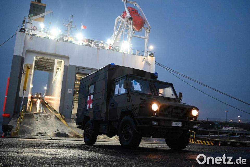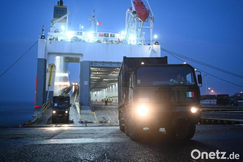 „Von heute an werden in Deutschland rund 10.000 Soldatinnen und Soldaten ankommen“, sagte der italienische General Nicola Mandolesi bei der Entladung eines ersten Frachtschiffes im Seehafen im ostfriesischen Emden. Am Morgen rollten Dutzende Militärlastwagen, Tankwagen und Jeeps einer italienischen Militäreinheit von Bord des Frachters „Severine“ an den Emskai – insgesamt rund 2.200 Ausrüstungs- und Materialteile brachte das Schiff.