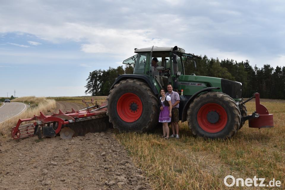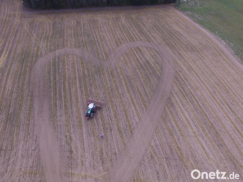 An diesem Tag steht eine Probelauf an. Widtmanns Vater sitzt auf seinem Traktor. Daran hat der Landwirt einen Grubber gehängt, mit dem er den Boden auf einem Feld bei Ebersdorf auflockert. Es staubt. In zwei weiten Bögen mal er so ein Herz auf das Stoppelfeld (Video im Onetz). Aufwendiger ist es, einen Schriftzug ins Feld zu mähen oder zu grubbern. Dann will Barbara Widtmann die Feldarbeit mit einer Drohne überwachen und so Anweisungen an den Bulldogfahrer geben. Bruder Christian Becher und Subunternehmer Marco Nißl sind für die technische Umsetzung zuständig. Die Bilder der Drohne empfangen auch die Heiratswilligen auf ihren Handys. Ein Video bleibt ihnen zur Erinnerung.