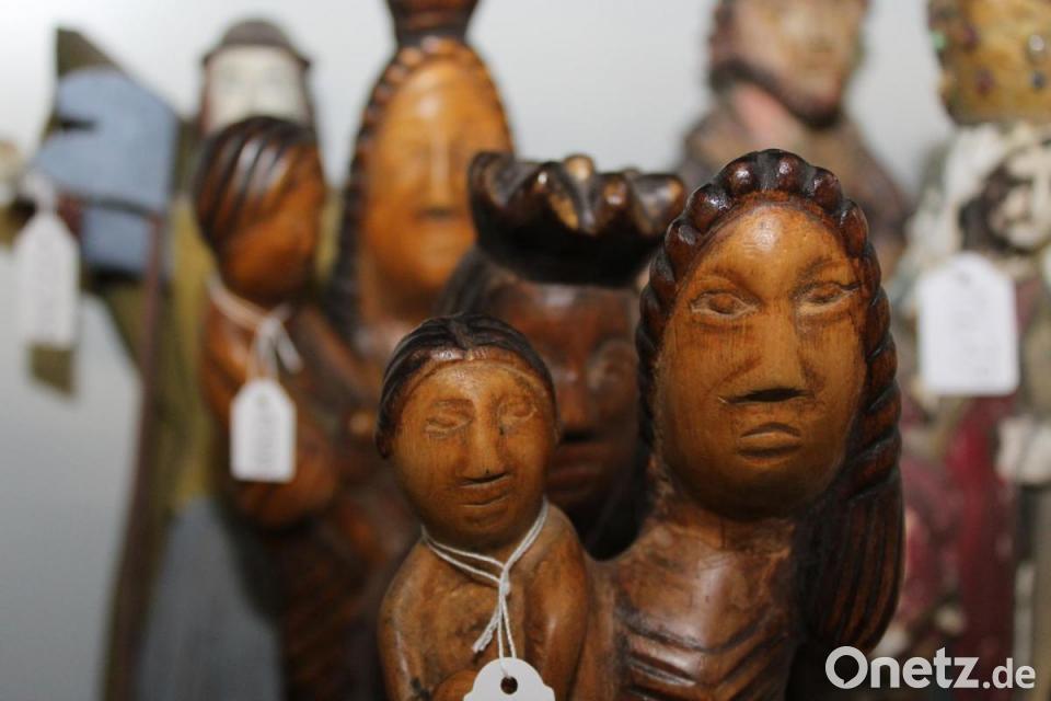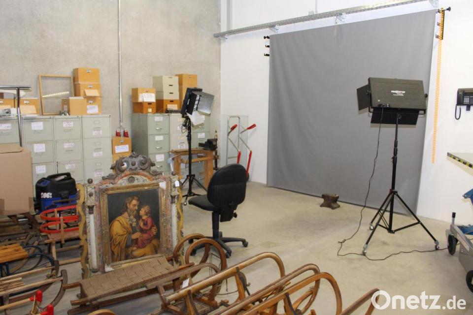 Weiter geht es ins eigentliche Depot. Bevor die Hallen betreten werden dürfen, müssen die Besucher aus Hygienegründen Hüllen über die Schuhe ziehen. Gleich hinter der Feuerschutztür ist ein kleines Fotostudio eingerichtet. Ein barockes Altarbild und mehrere hölzerne Kinderschlitten warten bereits auf ihr Shooting. Linkerhand stehen weitere Neuzugänge aufgestapelt, von der bunt bemalten Kinderwiege bis zur schwarzen Totenbahre. „Auch das gehört halt dazu“, sagt Ullmann-Süß. „Eine echte Rarität sind unsere vier Leichenwägen, die findet man nirgends mehr.“ Dass der Tod zum Leben gehört, war für frühere Generationen noch eine Selbstverständlichkeit. Selbst bei einem so freudigen Ereignis wie der Heirat fand er schon seinen Widerhall. Ullmann-Süß öffnet einen der zahllosen Schränke. Hier sind mehrere „Versehgarnituren“ aufbewahrt. So heißen die Utensilien, die der Pfarrer benutzt, wenn er das Sterbesakrament spendet. Versehgarnituren waren, erzählt die Expertin, ein fester Bestandteil der Aussteuer.