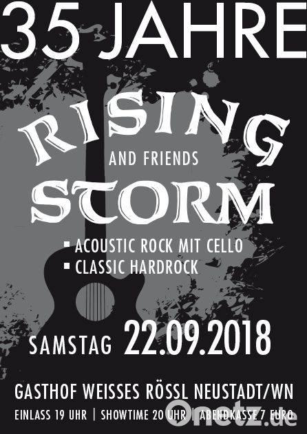 „Rising Storm“ laden am Samstag, 22. September, zu einer musikalischen Geburtstagsparty in den Gasthof „Weisses Rössl“ nach Neustadt/WN ein. Im ersten Teil des Abends präsentiert die Band zusammen mit Cellistin Karin Ehrmann Auszüge aus dem Programm „Rock meets Cello“. Im zweiten Teil gibt es klassischen Hardrock mit der Unterstützung einiger Gastmusiker.