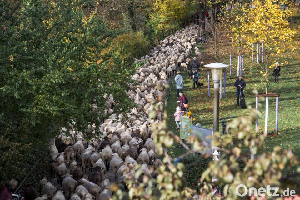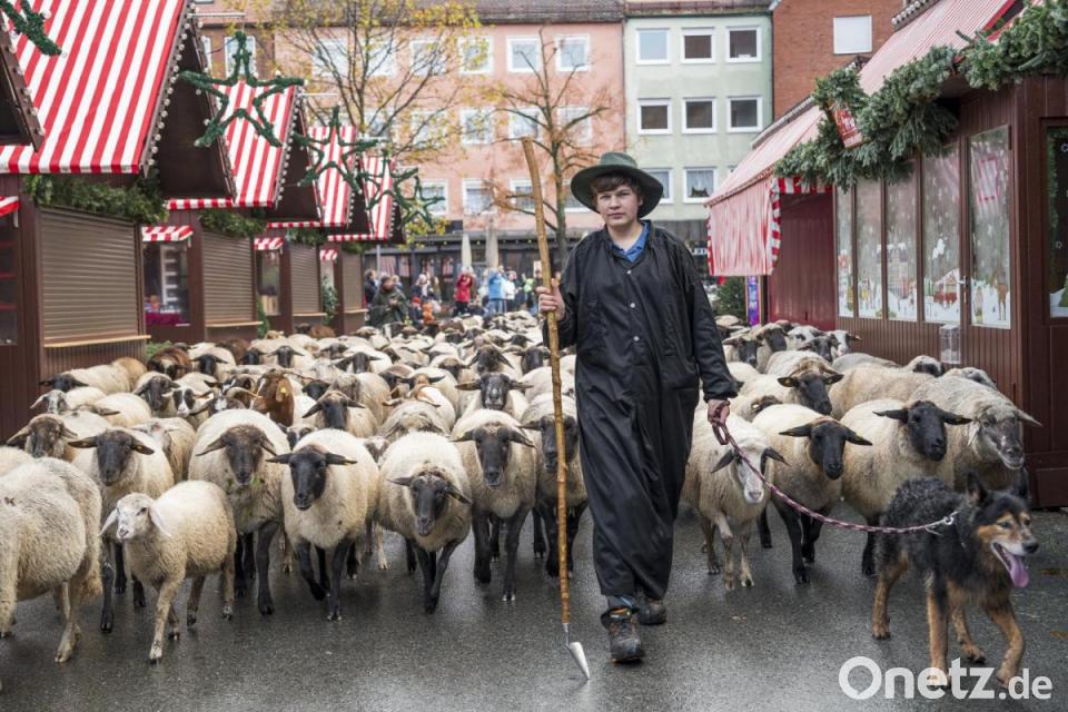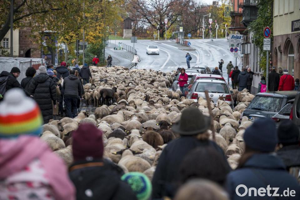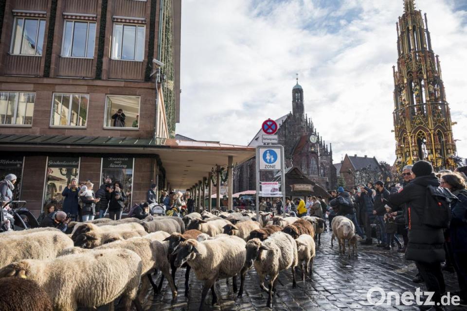 Mehrere Hundert Schafe sind am Sonntag mitten durch die Nürnberger Innenstadt gezogen. Schäfer Thomas Gackstatter überquerte mit seiner Herde auch den Hauptmarkt. Jedes Jahr im November macht er sich mit seinen Tieren auf diese Weise auf den Weg zu den Winterweiden westlich von Nürnberg. Im Sommer grast die Herde auf verschiedenen Wiesen im Stadtgebiet. Zahlreiche Bürgerinnen und Bürger beobachteten den Schafszug, darunter viele Familien mit Kindern.
