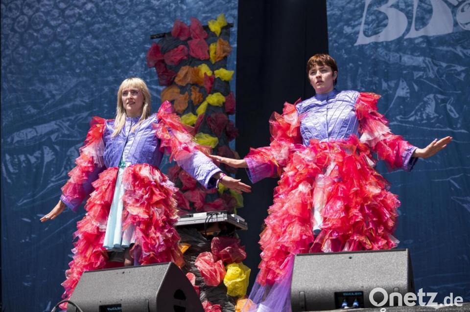 Als erste Band auf der Hauptbühne spielte am Freitagmittag die deutsche Indie-Pop-Band Blond. In schrillbunten Kostümen mit Tüllmänteln, die an Blumen erinnern, kam das Trio auf die Bühne und legte gleich richtig los. „Seid Ihr schon wach?“, rief Sängerin Nina Kummer. Dann ließ sie das Publikum als Aufwärmübung erstmal Schritte nachtanzen, die sie und ihre Schwester, die Schlagzeugerin Lotta Kummer, auf der Bühne vorführten.