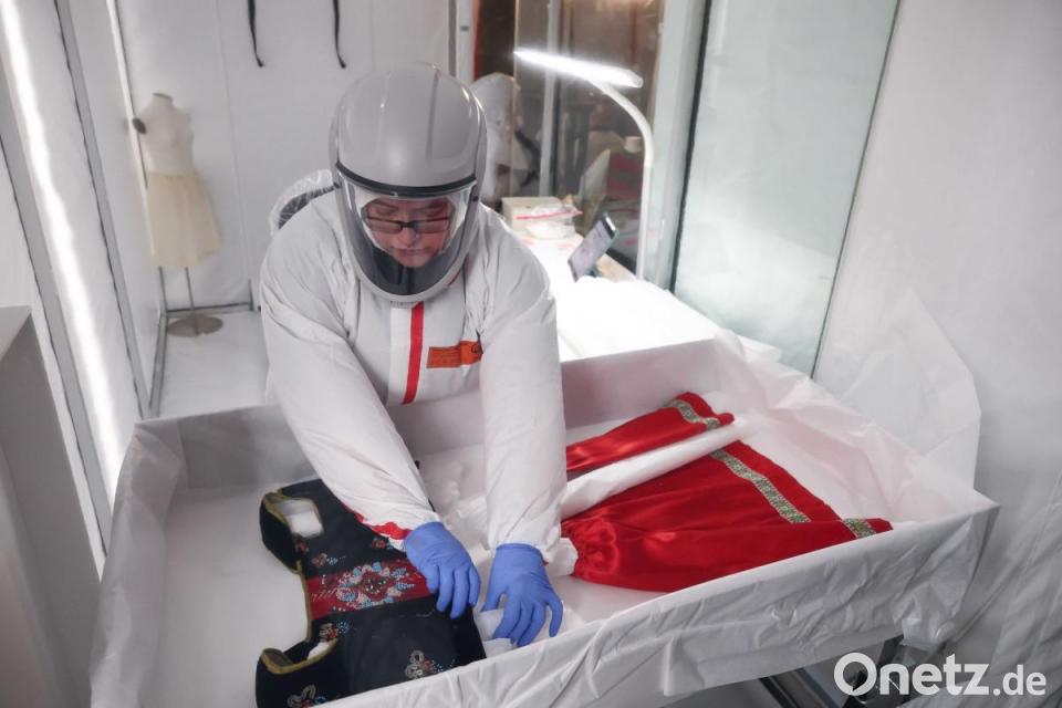 Zum Schutzanzug trägt sie dabei eine Atemmaske und zwei Paar Gummihandschuhe übereinander. Mit ihrer Kollegin Larissa Hollmann deponiert sie die 120 Jahre alten Textilien in einer großen Schachtel, sodass der Stoff keine Falten wirft.