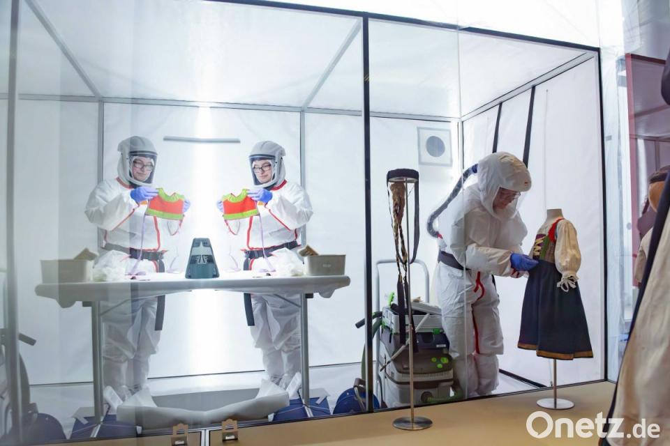 Problematisch sei vor allem der Staub, der auf den Stoffen hafte und kontaminiert sei, erläutert Restauratorin Meike Wolters. Früher seien die Textilien mit Insektengift behandelt worden, damit Motten und andere Schädlinge die wertvollen Stücke nicht zerstörten. „Jetzt ist man schlauer. Wir behandeln nur noch giftfrei.“