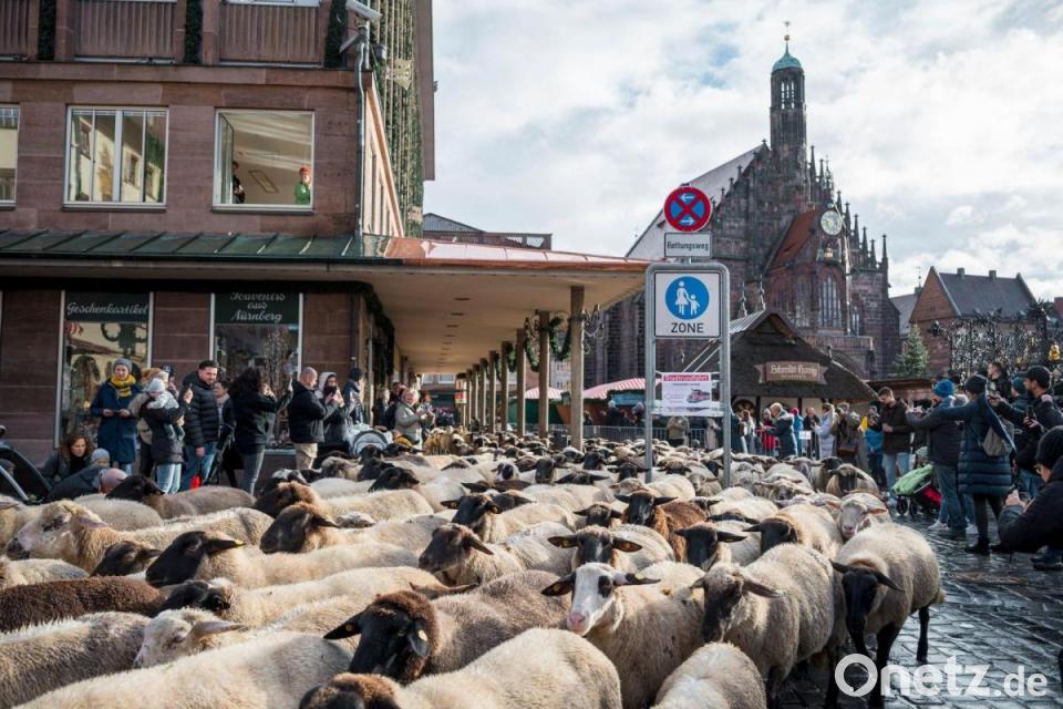 Rund 600 Schafe ziehen heute mitten durch die Nürnberger Innenstadt. Wie jedes Jahr im November treibt Schäfer Thomas Gackstatter seine Herde auf diese Weise zu den Winterweiden westlich von Nürnberg. Doch seit einiger Zeit zieht das Spektakel viele Schaulustige an, die die Schafe auf ihrem Weg über Straßen und Plätze in der Innenstadt beobachten und mit ihren Handys fotografieren.