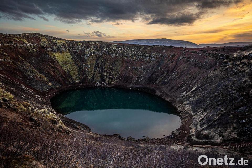 Der Kerid-Krater, ein Stück nördlich von Selfoss im Sonnenuntergang. Wer genau hinsieht erkennt am anderen Ende ein paar Besucher.