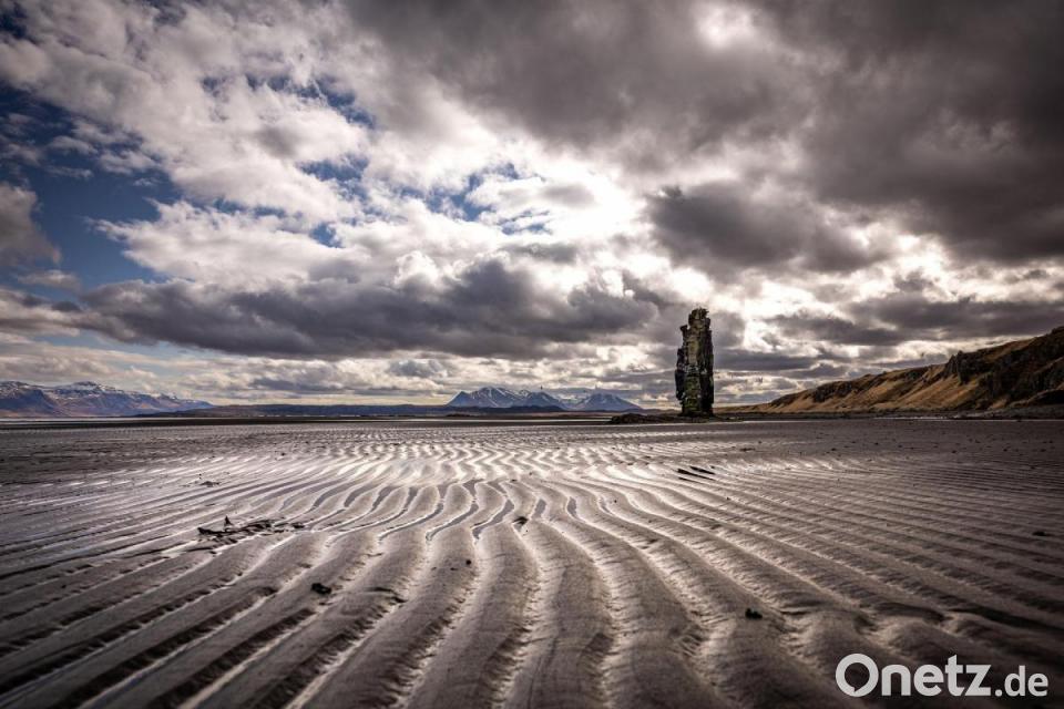 Der Basaltfelsen Hvitserkur im Nordwesten Islands. Bei Ebbe hat man die Möglichkeit vom Parkpklatz zum Felsen abzusteigen und "im Nordatlantik" zu fotografieren. Gute Schuhe sind hier aber Pflicht.
