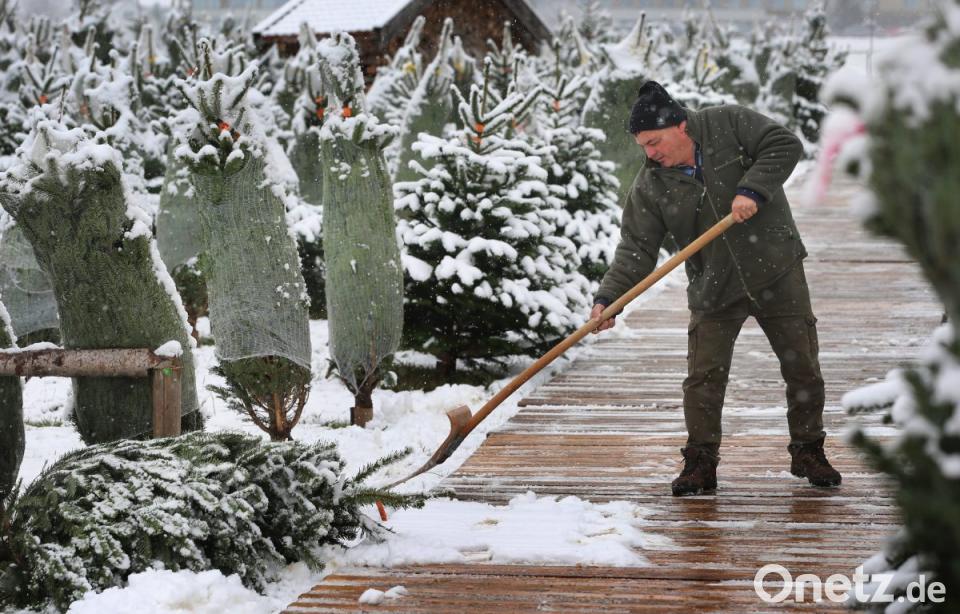 Ein Weihnachtsbaumverkäufer in Kmepten befreit die Wege auf seinem Gelände vom Schnee .