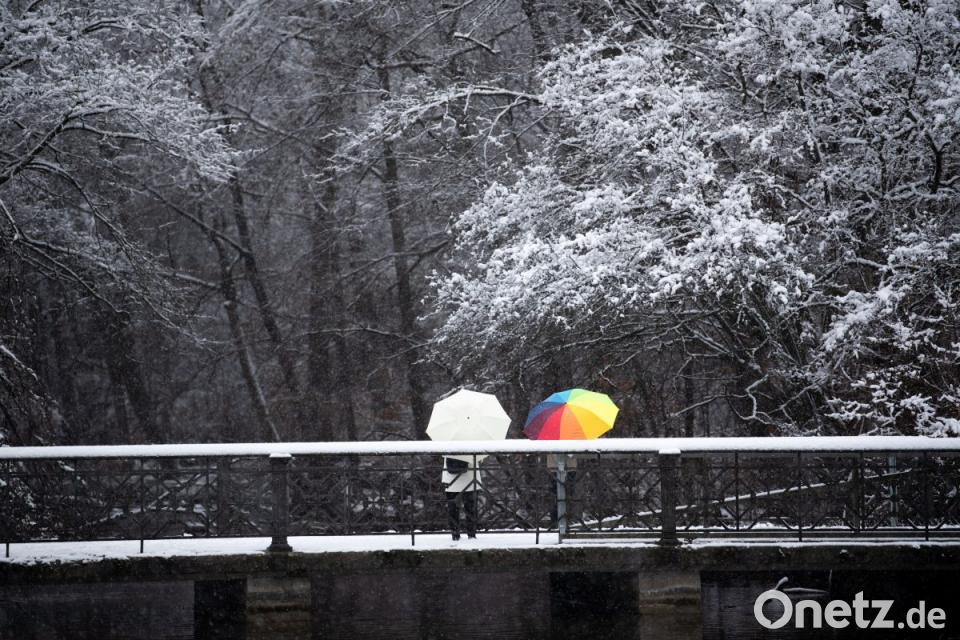 Ein Paar mit Regenschirmen steht im Nymphenburger Schlossgarten auf einer schneebedeckten Brücke.