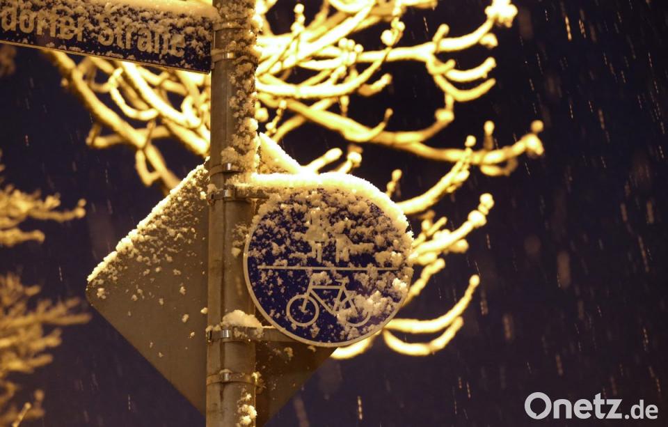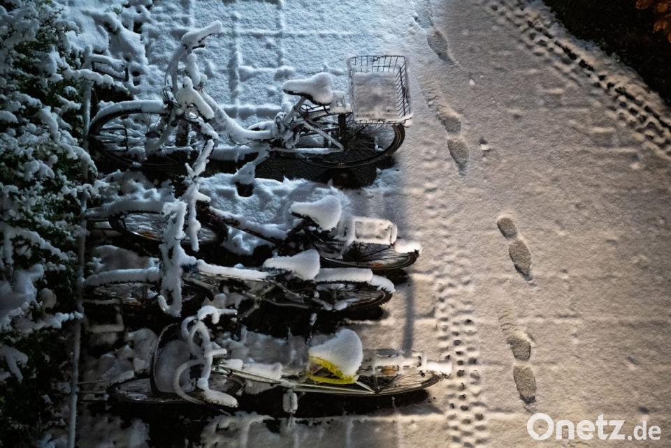 Bayern, Garching: Fußspuren sind im frischen Schnee neben einem Fahrradständer zu sehen.