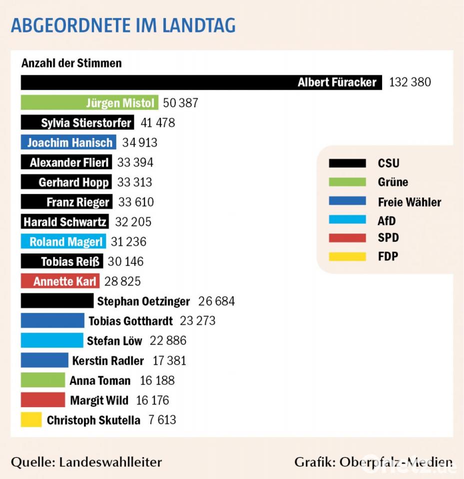 Nur 20 Prozent der Einwohner, aber beinahe 40 Prozent der Abgeordneten: Die beiden nördlichen Stimmkreise der Oberpfalz, Weiden und Tirschenreuth, dürfen sich als Sieger der Landtagswahl vom Sonntag fühlen - zumindest wenn es um die Zahl der künftigen Abgeordneten geht. Auch der Raum Regensburg wird gut vertreten sein. Stadt und Landkreis entsenden zusammen sechs Abgeordnete. Schwandorf verliert zwei Parlamentarier, behält aber auch zwei. Neumarkt, Cham und Amberg-Sulzbach bleibt jeweils der Direktkandidat der CSU.