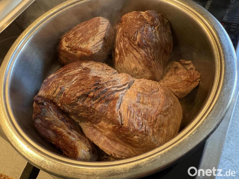 Für die sieben Portionen Ochsenrahmbraten hat Ilse Hauer mehrere Stücke Braten aufgetaut und ohne Fett von allen Seiten angebräunt. So verschließen sich die Poren und der Saft bleibt im Fleisch.