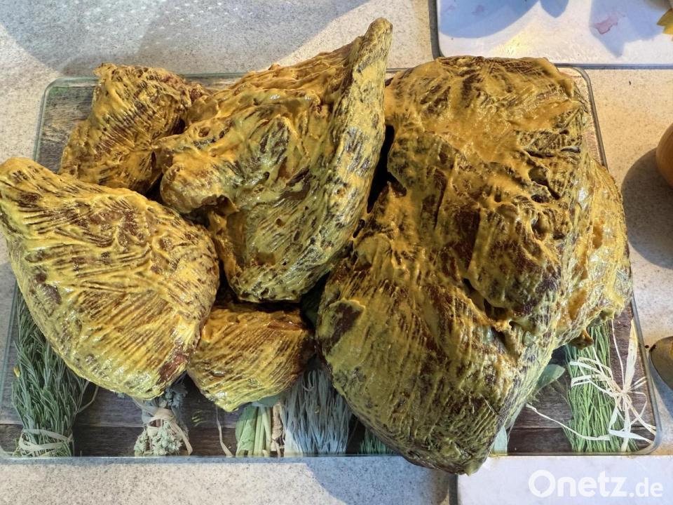 Wenn alles abgekühlt ist, am nächsten Tag das Fleisch in Scheiben schneiden. Das klappt im kalten Zustand wunderbar. Warm kann es leicht passieren, dass die Bratenstücke zerfleddern.
