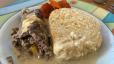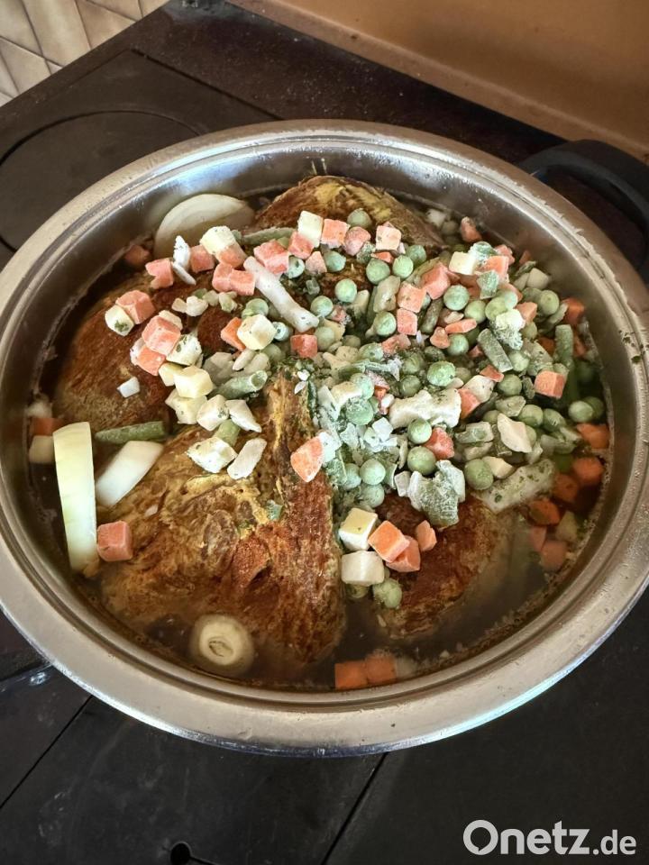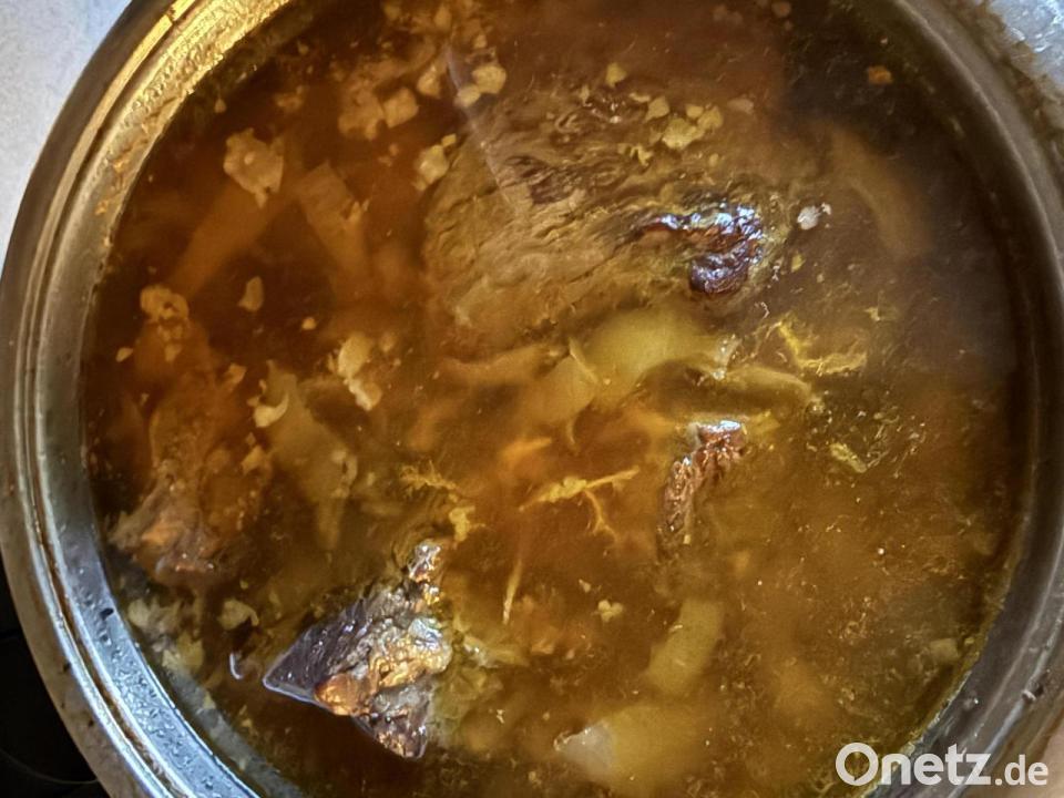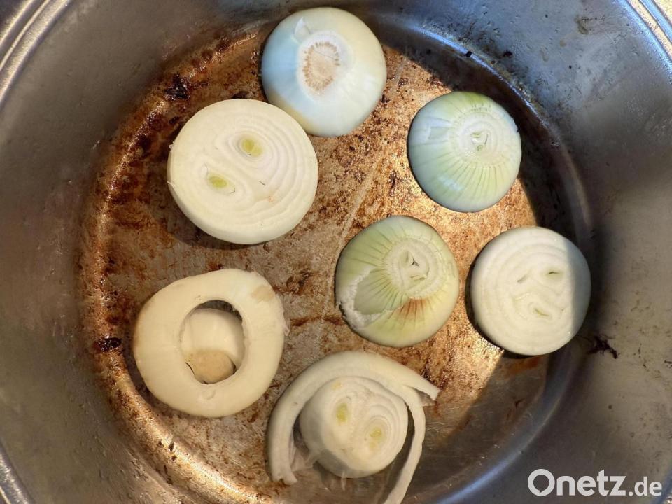 Den angebräunten Topfboden mit Zwiebelscheiben auslegen und darauf das Fleisch schlichten. Mit Wasser aufgießen, bis das Fleisch bedeckt ist, Suppengemüse – Ilse Hauer schwört auf Biogemüse – sowie zwei geviertelte Zwiebeln und gekörnte Gemüsebrühe zugeben.