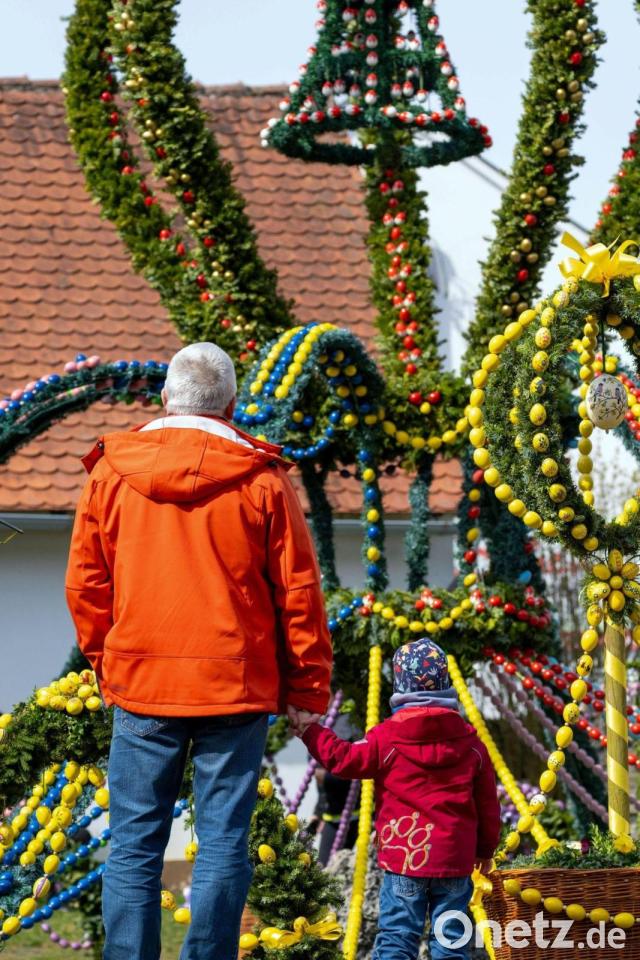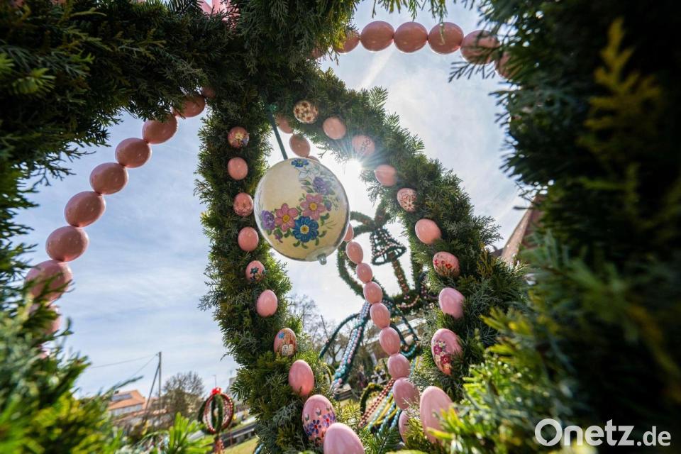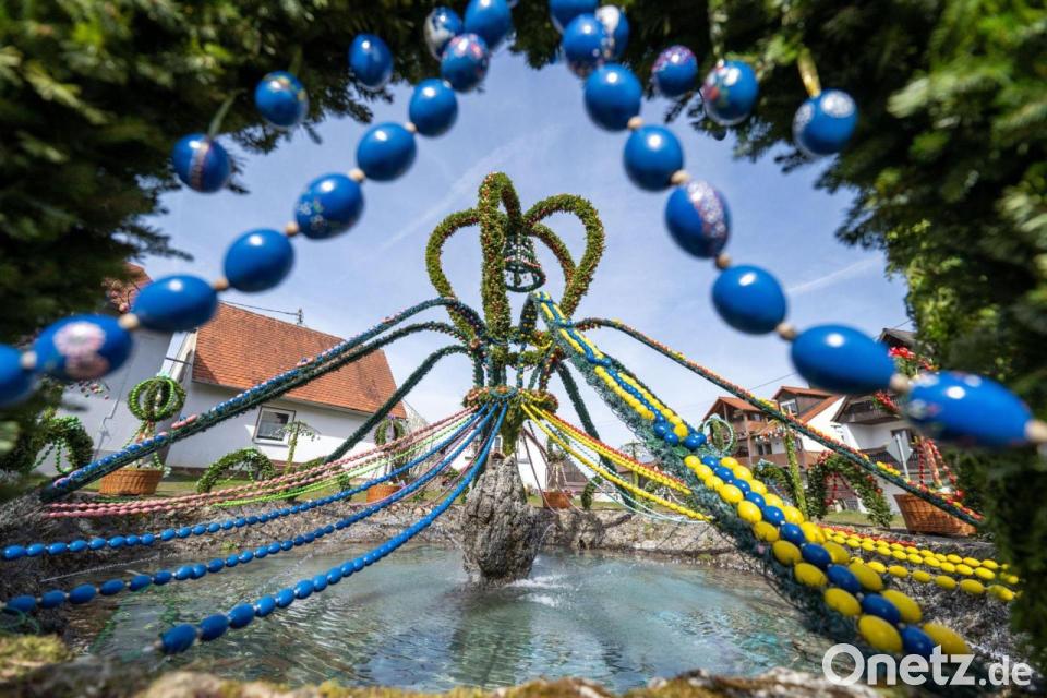 Zu den berühmtesten geschmückten Wasserstellen zählt der Osterbrunnen von Bieberbach im Landkreis Forchheim: Rund 10.000 bunt gemalte Eier sind an den Girlanden angebracht. Sie sind oft kunstvoll verziert mit österlichen Motiven. Der Andrang in Bieberbach ist jedes Jahr zur Osterzeit groß – teils kommen die Menschen sogar mit Bussen in das beschauliche Dorf, um sich anzuschauen, wie die ehrenamtlichen Helferinnen und Helfer den Brunnen geschmückt haben.