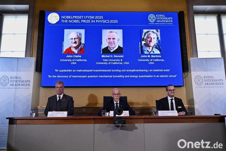 Der Nobelpreis für Physik geht in diesem Jahr an die Quantenforscher John Clarke (Großbritannien), Michel Devoret (Frankreich) und John Martinis (USA). Das teilte die Königlich-Schwedische Akademie der Wissenschaften in Stockholm mit. Die Experimente der Preisträger zeigten Quantenphysik in Aktion. Die bedeutendste Auszeichnung für Physiker ist in diesem Jahr mit insgesamt elf Millionen Kronen (rund eine Million Euro) dotiert. Sie geht zu gleichen Teilen an die Forscher.