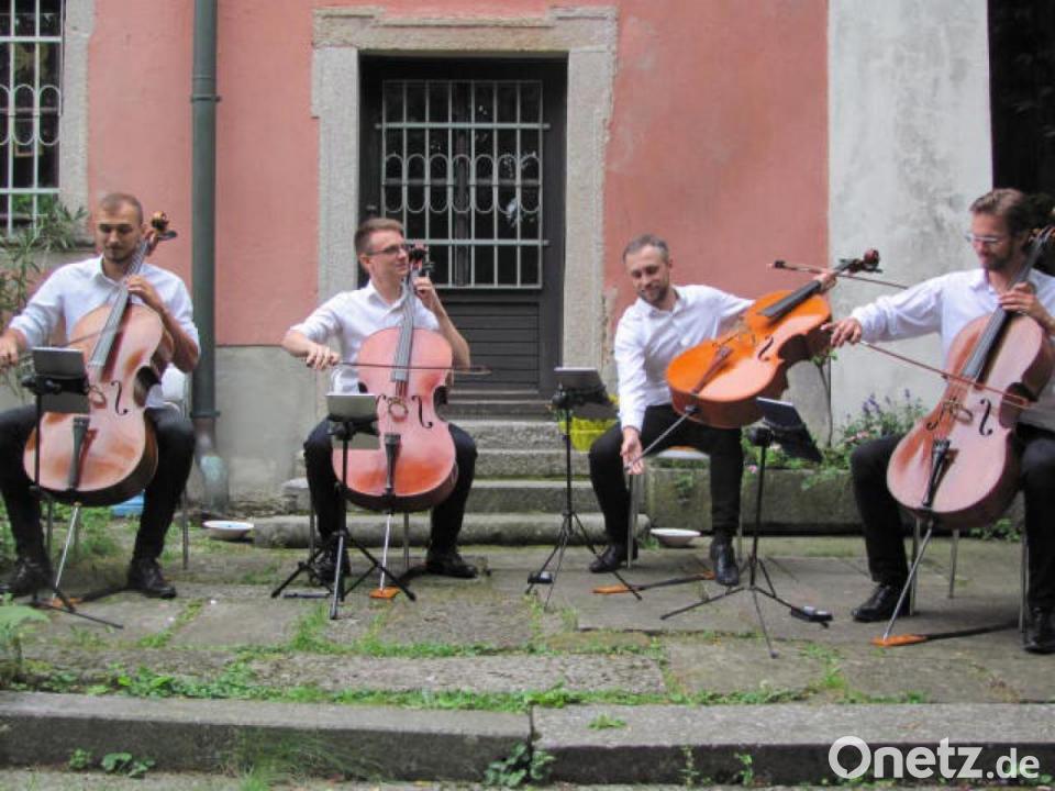 Mit ihren Adaptionen bekannter Kompositionen wollen die Cellisten junge Menschen für die Musik begeistern und ihnen - in fröhlich gelaunter Aufbereitung - Zugang dazu verschaffen. Vor den Musikern stehen keine Notenständer mit Blättern, sie benutzen Tablets. Jung und aufgeweckt sind die Cellisten (Geburtsjahrgänge von 1985 bis 1988), die Zuhörer, überwiegend im gesetzten Alter, sind keinesfalls weniger begeistert. Um die Instrumente nicht dem Regen auszusetzen, schlagen die Prager vor, den Platz unter dem Laubdach der großen Kastanie im Pfarrhof mit dem Publikum zu tauschen.