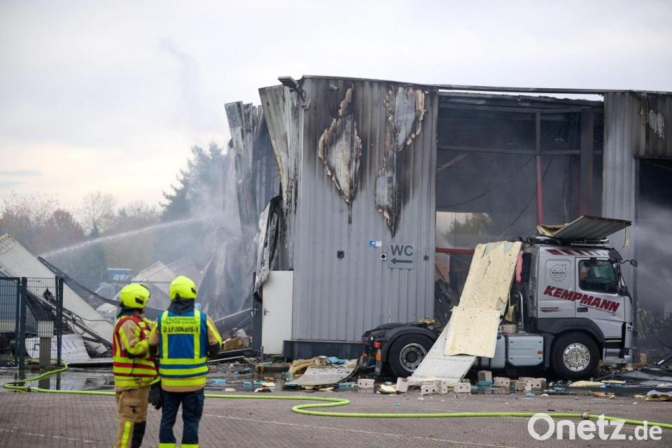 Mehrere Fahrzeuge auf dem Gelände wurden beschädigt. Ein Tor der Halle flog durch die Druckwelle der Explosion etwa 15 Meter weit durch die Luft, wie der Feuerwehrsprecher schilderte. Stahlträger der Halle seien verbogen worden.