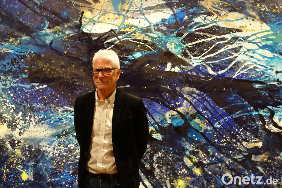 Bernd Zimmers Acrylbilder messen im Schnitt etwa zwei auf drei Meter und treten in der Regel als Zyklen auf. Der Künstler hat sie mit großem körperlichen Einsatz auf die Leinwand gepinselt, gespritzt, fließen lassen und den Bildträger dabei immer wieder bewegt. Vorher war er um die halbe Welt gereist, um Inspirationen einzufangen. Russland, China, Indien. Wüste, Dschungel Meer. Bernd Zimmer arbeitet in großen Dimensionen.