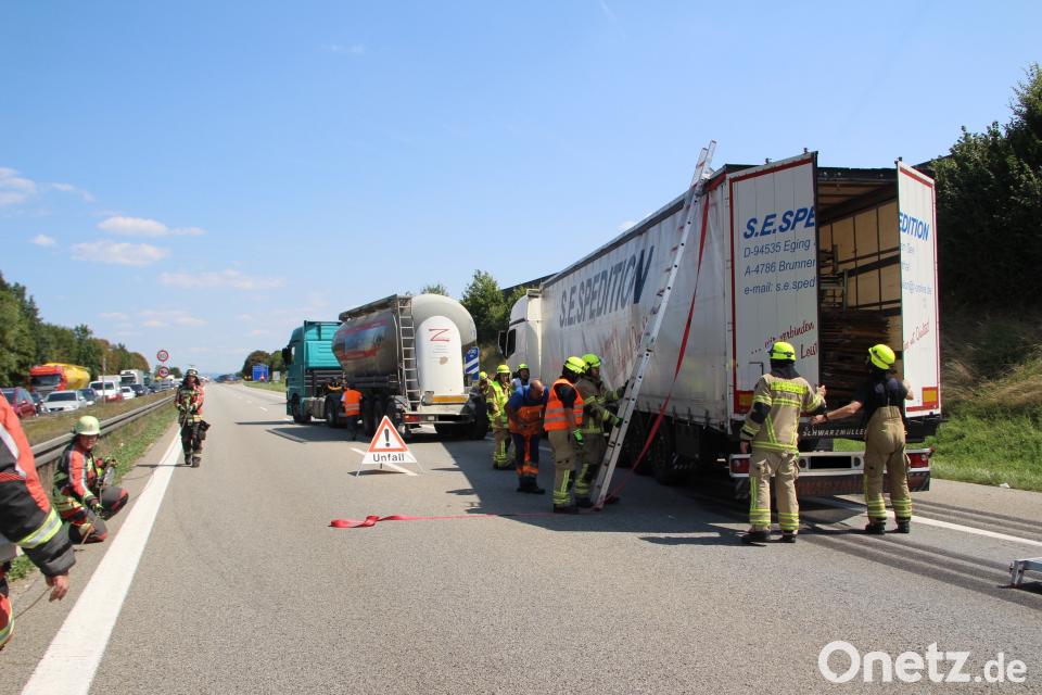 Auch auf der A3 zwischen Regensburg Universität und Burgweinting in Fahrtrichtung Passau kam es zu einem Verkehrsunfall. Ein Lastwagenfahrer übersah wohl nach ersten Vermutungen das Stauende, versuchte noch dem vor ihm stehenden Tanklastzug auszuweichen und kollidierte mit seinem Auflieger trotzdem noch mit diesem. Die Freiwillige Feuerwehr Burgweinting sowie die Berufsfeuerwehr sicherten die Unfallstelle ab. Die Autobahn A3 musste komplett in diese Fahrtrichtung gesperrt werden. Den beiden Fahrern ist glücklicherweise nichts passiert. Es entstand ein Schaden von rund 6000 Euro.