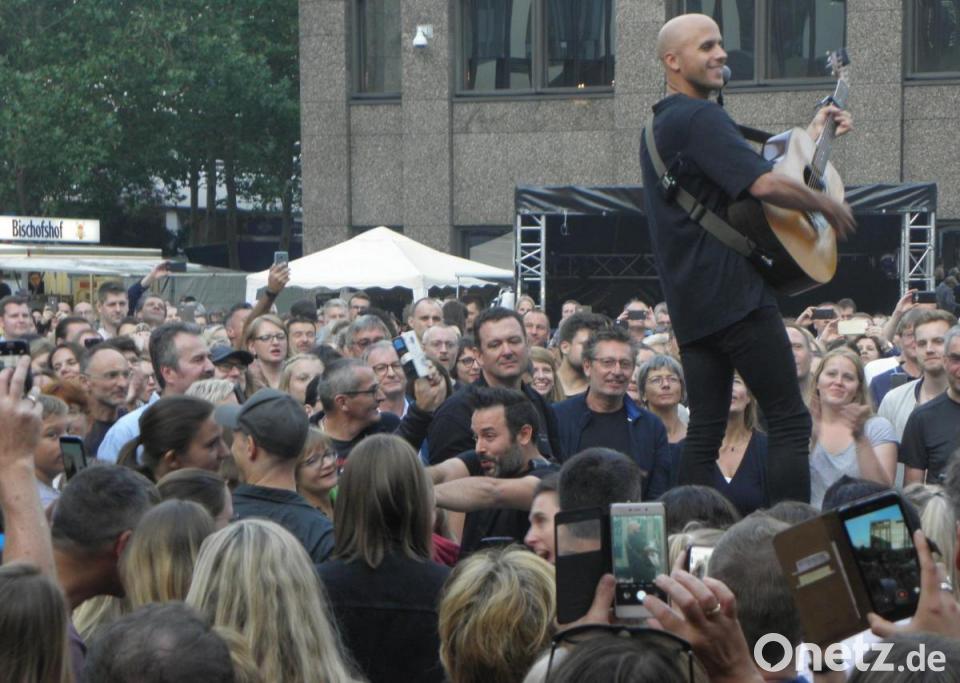 Die Fans warten am Samstag gespannt auf den Auftritt. Alle Blicke richten sich in Richtung Bühne. Plötzlich steht er mitten unter ihnen auf der Piazza. Ausgestattet mit Gitarre und einem Mikroständer, den ihm die Security hält, eröffnet er das Konzert von ungewöhnlicher Position aus. "You don't know" singt er an dieser Stelle, wobei sich rund herum alle Handys zum Fotografieren und Filmen auf ihn richten.