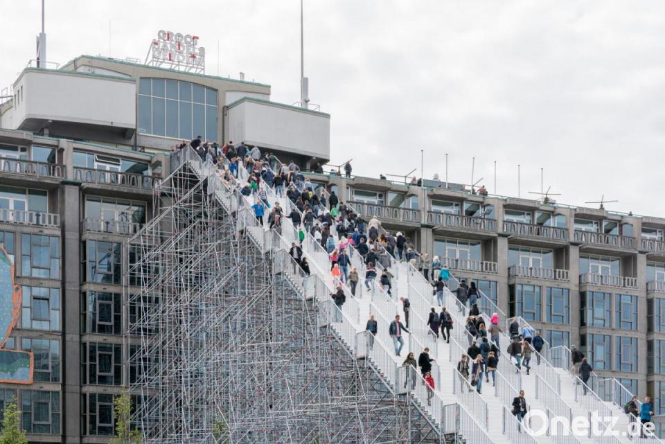 Zu einem Vorreiter hat sich das Büro beim Thema Zwischennutzung entwickelt. Das wohl bekannteste Projekt: 2016 stellten die Architekten anlässlich eines Kulturfestivals für einen Monat eine riesige Freitreppe aus Gerüsten neben einem Nachkriegsbau am Rotterdamer Hauptbahnhof auf. Plötzlich konnten die Menschen das großflächige Dach des Gebäudes erklimmen und einen spektakulären Blick über die Stadt erleben. „Das war gut für die Fitness der Rotterdamer, jeder wollte hoch“, erzählte Knikker grinsend. Wichtig für ihn: Es gab keinen Abfall, die Gerüste wurden später anderweitig genutzt, das verwendete Holz wiederverwertet.